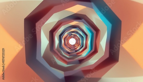 Abstract geometric tunnel with colorful shapes in a 3D render.