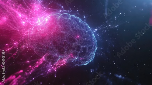 Abstract glowing AI brain concept with swirling light trails and connected nodes, minimalist futuristic background