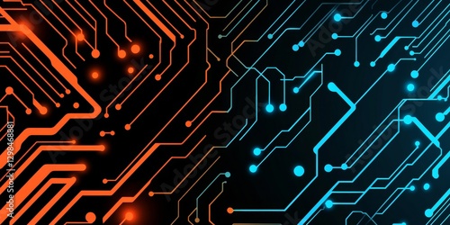 Abstract Glowing Circuit Board Design, Orange and Cyan on Black, Technology Background