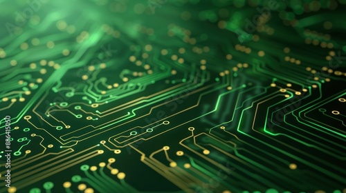 Abstract glowing circuit board with green and gold lines.