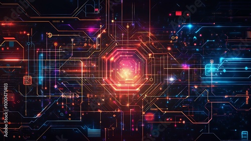 Abstract glowing digital network with colorful lines and glowing center on a dark background.