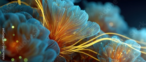 Abstract glowing floral background with blue petals and golden light trails, creating a magical and ethereal atmosphere Concept of fantasy, beauty, and luminescence