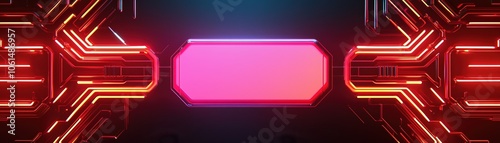 Abstract glowing neon frame with intricate circuit patterns on dark background.