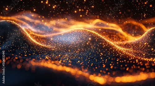 Abstract glowing orange particles forming a wavy landscape against a dark background with bokeh effect
