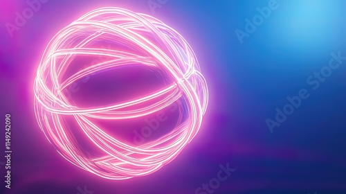 Abstract glowing pink sphere with neon light trails on a blue background.