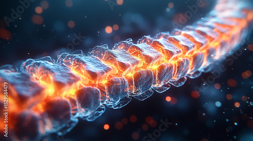 Abstract glowing spine, fiery chain reaction, microscopic view, sparks