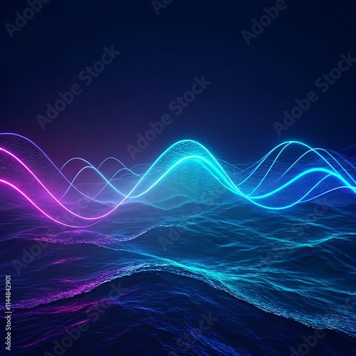 Abstract glowing waves of neon blue and pink over a dark ocean surface, creating a futuristic ambiance.