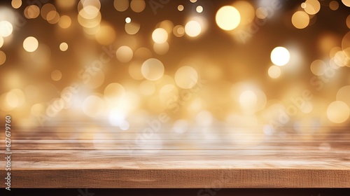 abstract gold background with blur bokeh light, glitter glow magical moment luxury atmosphere on wood ground stage, Generative Ai