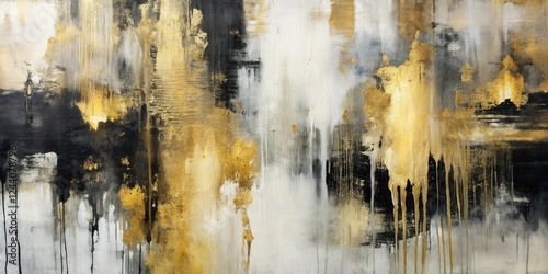 Abstract Gold, Black, and Gray Canvas Painting with Dripping Texture