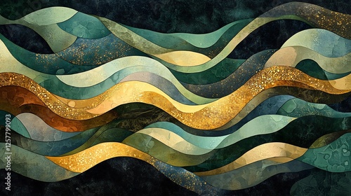 Abstract Gold Green Waves Flowing Serene Abstract Art. AI Generated