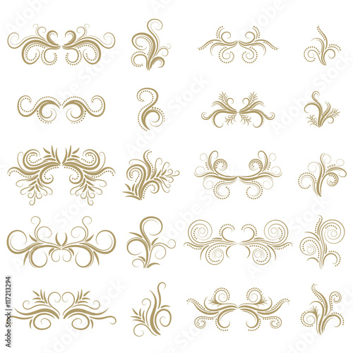 Abstract golden curly design element set isolated on white background. Gold dividers. Swirls. Vector illustration.