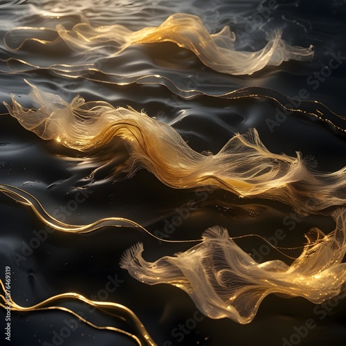 Abstract golden ink swirling in water with black background, soft floating texture, luxury motion background, smooth lighting, elegant