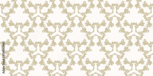 Abstract golden vector background with curly shapes, swirls, floral elements. Elegant damask seamless pattern. Ornament texture in baroque, rococo, renaissance style. Repeated gold and white design