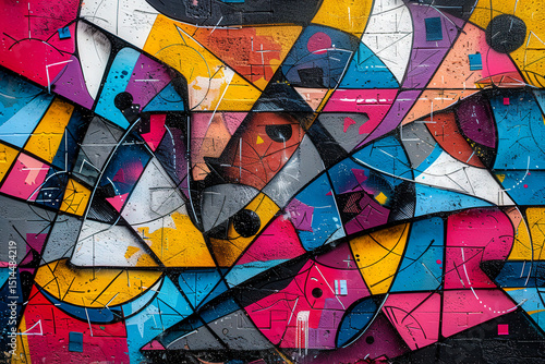 Abstract graffiti in style of street pop art, bright colors, dynamic shapes, bold lines, energetic composition, modern street art, expressive contrasts, original symbols and graphics.
