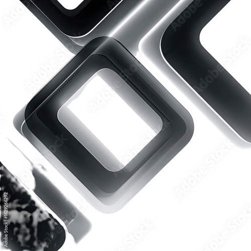 Abstract graphic design, featuring overlapping, geometric shapes in shades of gray