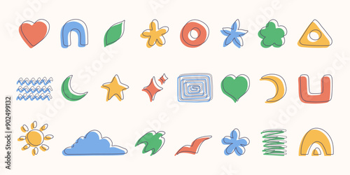 Abstract graphic doodles of symbols and shapes. Decorative stickers and design elements. Vector illustration.