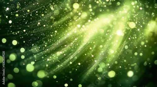 Abstract green and yellow bokeh background with light rays and sparkles.