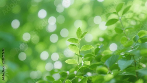 Abstract green foliage with soft bokeh lights, evoking nature's tranquil essence