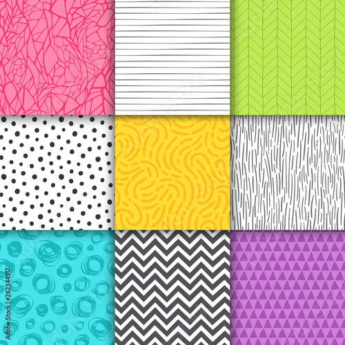 Abstract hand drawn geometric simple minimalistic seamless patterns set. Polka dot, stripes, waves, random symbols textures. Vector illustration