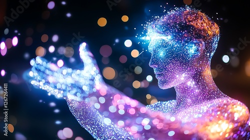 Abstract Holographic Figure Performing at a Futuristic Concert with Vibrant Lights and Digital Effects Displayed on a Dark Blurred Background