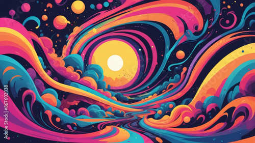 Abstract horizontal background with colorful waves. Trendy illustration in style retro 60s, 70s.