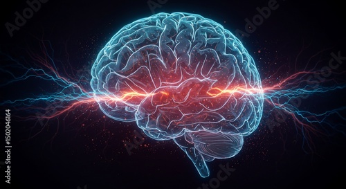 Abstract human brain in motion with glowing blue fractal energy and plasma lightning patterns