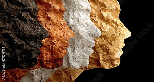 Abstract human head silhouettes in profile, artfully crafted from crumpled paper textures, symbolizing thought, creativity, and the human mind's intricate design, perfect for conceptual projects.