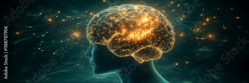 Abstract Human Head With Glowing Brain, Neural Networks, Digital Art, Futuristic Technology