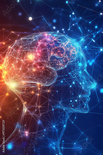 Abstract Human Head with Neural Connections and AI Symbols on a Blue Technology Background