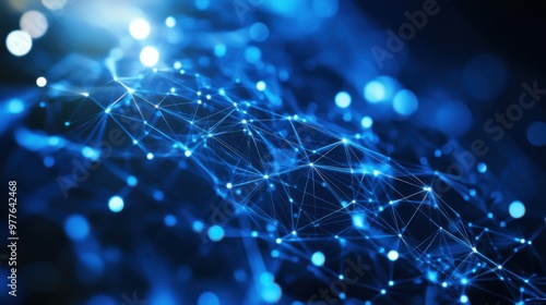 Abstract illustration featuring plexus blue geometrical shapes, representing connection and web concept, with digital communication and technology network background comprising moving lines and dots-s