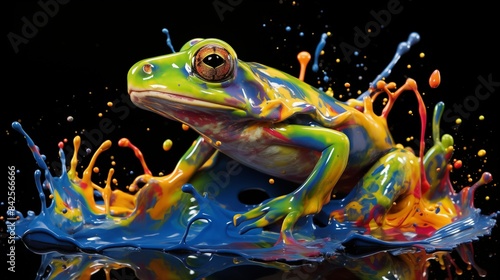 Abstract illustration of a colorful frog in a color explosion on a black background