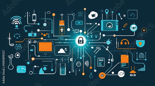 Abstract Illustration of a Complex Network of Connected Devices and Symbols