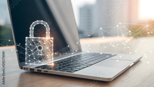 Abstract illustration of a laptop and padlock, symbolizing cybersecurity and technology