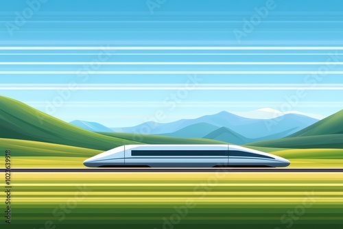 Abstract illustration of a modern train speeding through lush green hills under a blue sky.