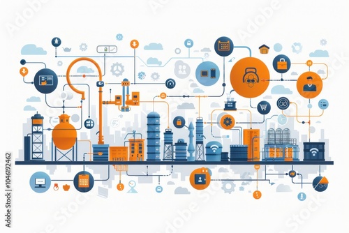 Abstract illustration of an industrial city with connected icons representing modern technology, communication, and innovation.