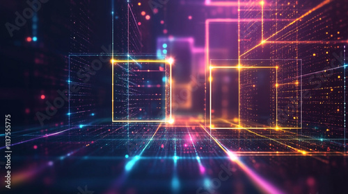 Abstract illustration of geometric shapes and structures in bright neon colors Neon Digital Grid.