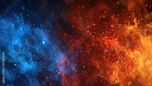 Abstract image of a fiery inferno clashing with cool blue smoke, full of sparks and ethereal glow
