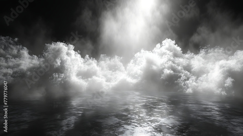 Abstract image of dark room concrete floor. Black room or stage background for product placement.Panoramic view of the abstract fog. White cloudiness. Generative Ai