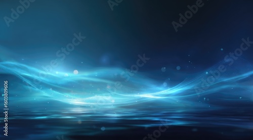 Abstract image of ethereal, glowing blue waves reflecting on a dark, still surface, with subtle bokeh effects adding depth and luminosity