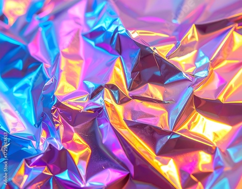 Abstract image of iridescent, crumpled foil with vibrant color shifts and folds