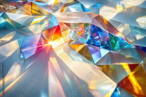 Abstract image of iridescent glass prisms refracting light, creating vibrant rainbow colors and dazzling patterns.