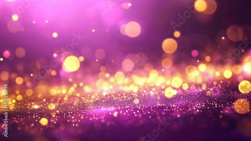 Abstract image of shimmering, purple and gold bokeh lights, festive and elegant.