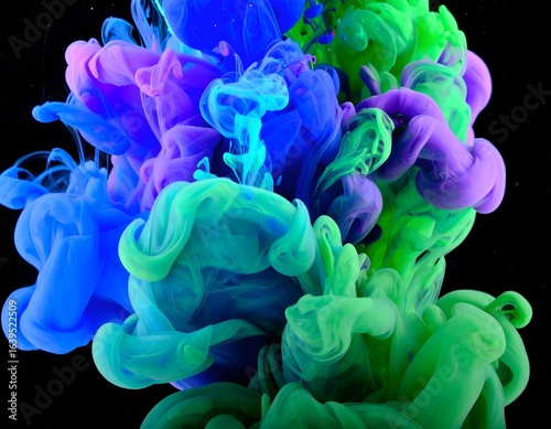 Abstract image of vibrant blue, green, and purple ink swirling and mixing together in water against a black background.