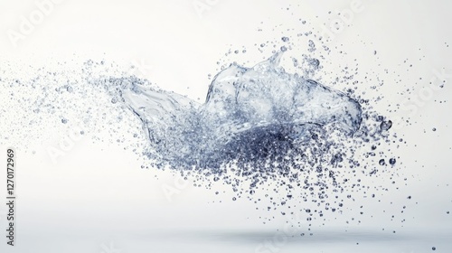 Abstract image of water splashing and bursting into droplets against a white background. The dynamic movement of the water creates a sense of energy and freshness.