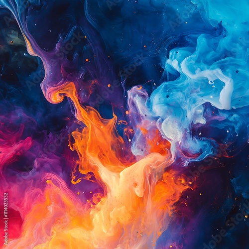 Abstract ink explosion with vivid colors forming flame in motion image