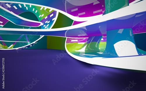 Abstract interior of the future in a minimalist style with colored gradient sculpture. Night view . Architectural background. 3D illustration and rendering