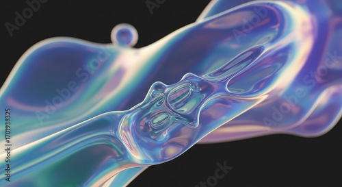 Abstract iridescent fluid shape with holographic colors flowing against a dark background, creating a dynamic visual effect.