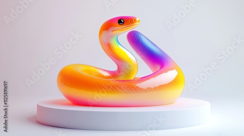 Abstract iridescent snake sculpture on a glowing white pedestal