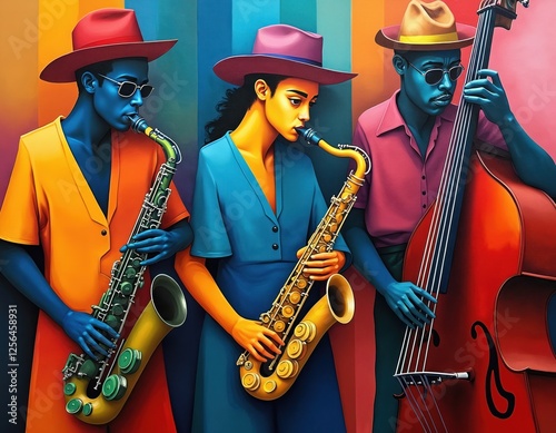 Abstract jazz ensemble illustration with colorful symphony of instruments. Three musicians play saxophone, double bass with rythmic melody, harmony. Art composition. Perfect background for jazz music