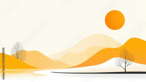 Abstract Landscape Art with Orange Sun and Minimalist Mountains